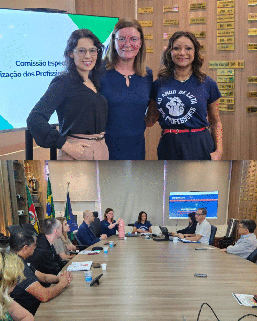 Na manhã de ontem (24), as diretoras Débora Soares, Fabiana Zonta e Geniane Dutra, estiveram presentes na reunião da Comissão de Valorização dos Profissionais da Educação. O encontro aconteceu no Plenarinho da Câmara de Vereadores, e teve como pauta a data-base do magistério.
